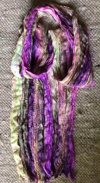 Acid dyed silk, microwaved, then while still damp, twisted very tightly, lengthwise, into a skein until dry. The dried scarf when unfurled retains the pleats created when twisted — a fun colorful crinkle scarf.